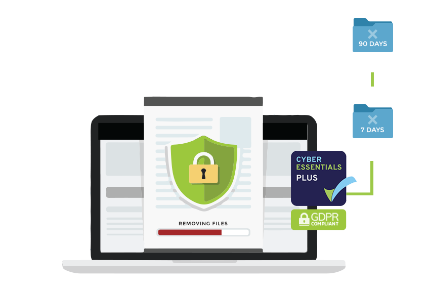 Zero Trace: 100 days after the Data is deleted the backups will be over written and there is then zero trace of the original Data or Supporting documents.