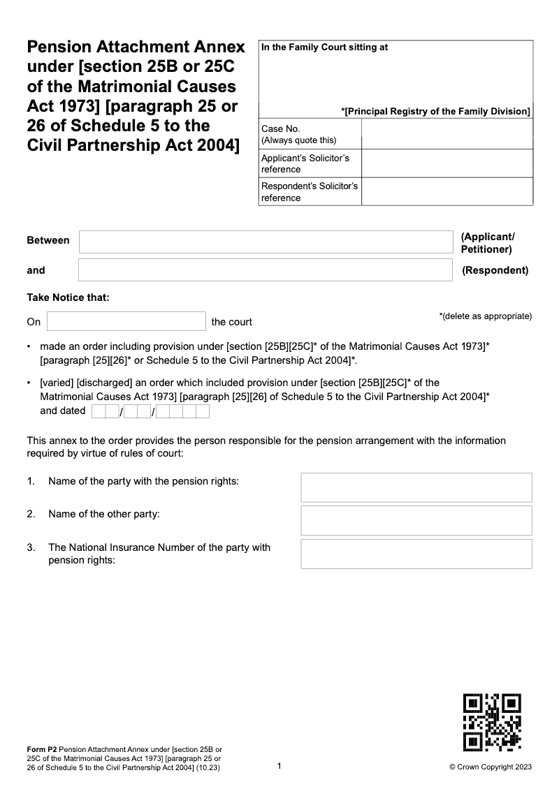 Pension Attachment Annex under (section 25B or 25C of the Matrimonial Causes Act 1973) (paragraph 25 or 26 of Schedule 5 to the Civil Partnership Act 2004) [FORMP2] DIV37