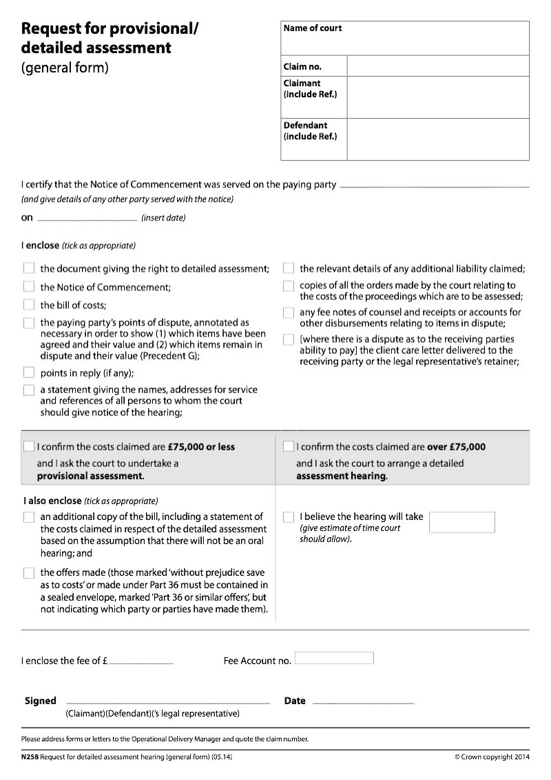 Request for provisional/detailed assessment (general form)