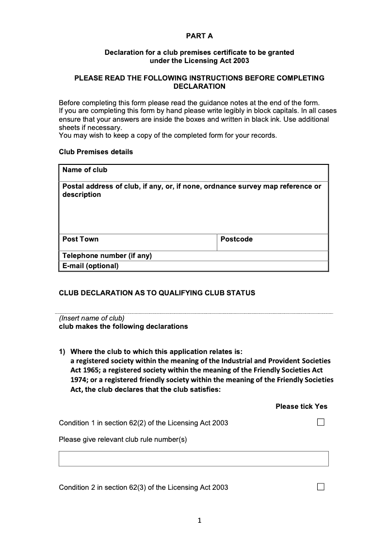 Declaration for a club premises certificate to be granted under the Licensing Act 2003 (Schedule 9A)